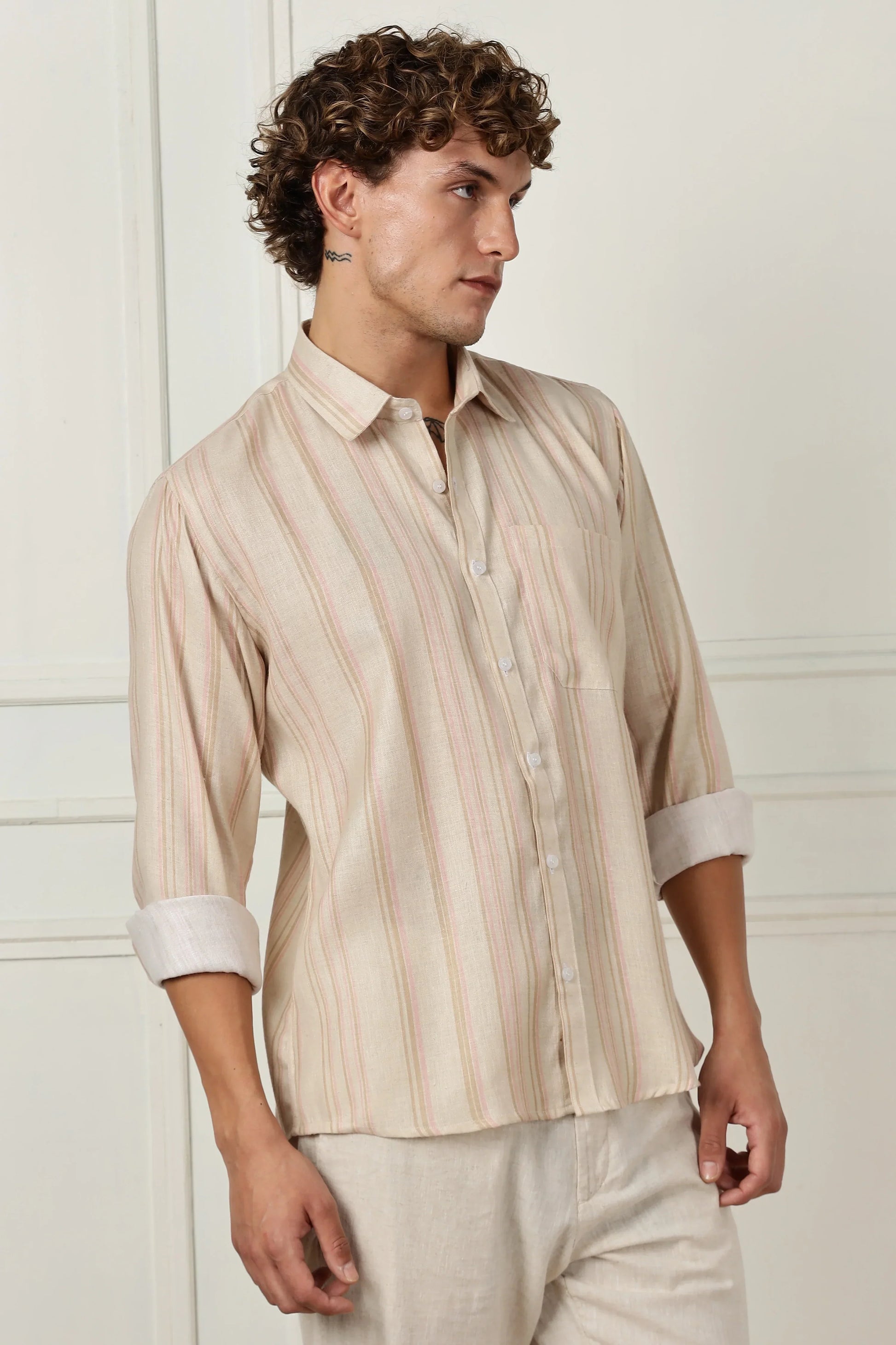 Beige stripe printed full sleeve linen shirt