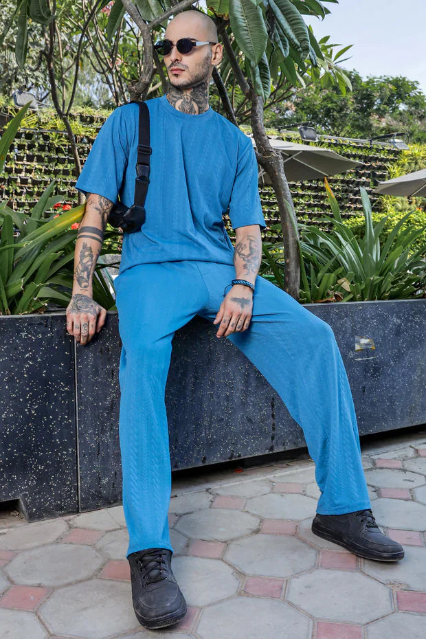 Blue Textured Oversized Round Neck Tee & Track Pant Co-ord Set