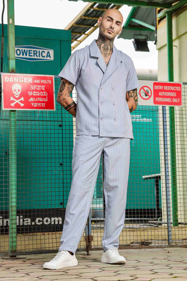 Grey Jacquard Textured Korean Streetwear Notched Lapel Collar Shirt & All Day Pants Striped Co-ord Set