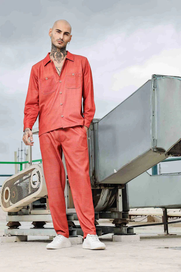 Rust Oversized Textured Fabric Shacket Shirt & All Day Pants Co-ord Set